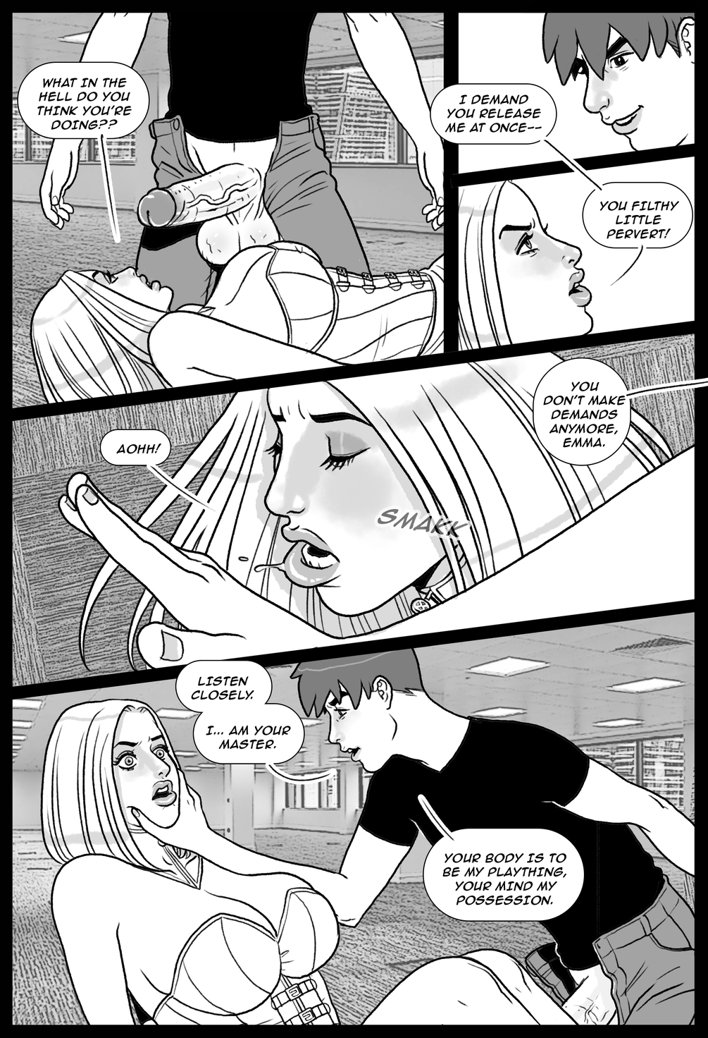 Emma Frost visits a potential recruit to the Xavier Academy, a young mutant with mysterious powers. The overconfident White Queen soon finds herself at the boy's mercy, and experiences firsthand his power: mutant pheromones that can make any woman his devoted slave. Can the icy telepath resist his powers, or will Emma be the first conquest in the Submission Agenda?